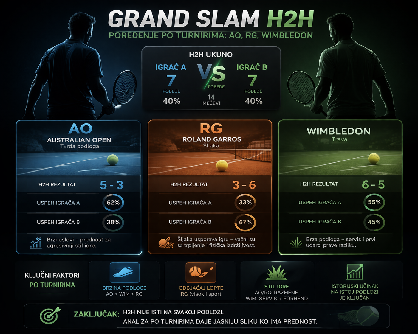 Najvažnija lekcija iz teme Grand Slam H2H jeste da veliki igrači nisu dominirali samo ukupno, već i teritorijalno, po turnirima. Djokovic ima snažan pečat u Melburnu i veoma jak trag na Wimbledonu protiv najvećih rivala. Nadal praktično pretvara Roland Garros u poseban svet u kome važe druga pravila. Federer na Wimbledonu protiv Nadala i dalje drži jasan plus, iako ukupno rivalstvo ide na Rafaelovu stranu.